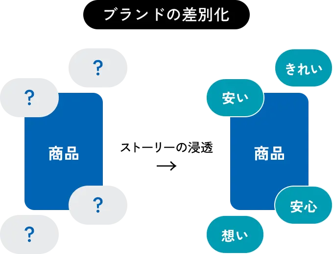 ブランドストーリーの目的は、市場で競合他社と差別化を図るべく、独自の“語れる強み”をつくること。私たちは、組織の現状や思いを丁寧にヒアリングし、商品やサービスの価値を伝え、ユーザーの共感と感情的つながりを生む物語を紡ぎます。ブランドストーリーの確立により、一貫した価値観と他者との明確な差別化で、価格競争に巻き込まれない強みを見出すことができるのです。